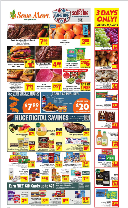 Today’s Savemart ad is packed with great deals! Find discounts on fresh produce, meats, bakery items, and frozen foods, including buy-one-get-one-free offers and top brand savings.